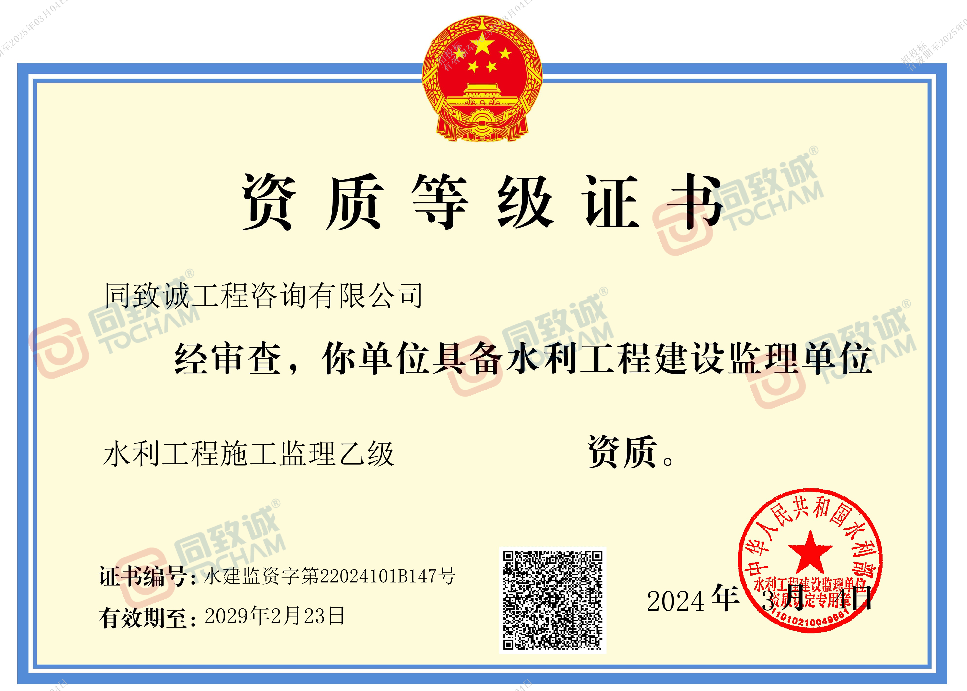福龍盈春新征程,同誠共志添新資。近日,經中華人民共和國水利部核準,同致誠工程咨詢有限公司成功取得“水利工程施工監理乙級資質”和“水土保持工程施工監理乙級資質”,可在資質等級許可的范圍內從事水利工程施工和水土保持工程施工監理業務,標志著我司監理業務范圍得到拓展和延伸,公司實力進一步提升。