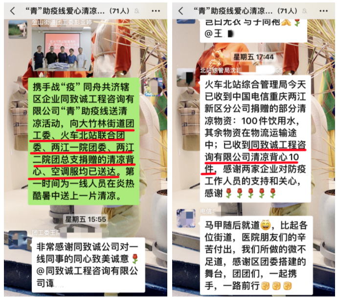 高溫送清涼,同心戰(zhàn)疫情。同致誠(chéng)總部積極響應(yīng)兩江新區(qū)團(tuán)工委組織發(fā)起的“‘青’助疫線·送愛(ài)心送清涼”活動(dòng),做好一線工作人員后勤服務(wù)保障及防暑工作,分別向重慶兩江新區(qū)大竹林街道團(tuán)工委、火車北站地區(qū)聯(lián)合團(tuán)委、重慶兩江新區(qū)第一人民醫(yī)院團(tuán)委、重慶兩江新區(qū)第二人民醫(yī)院團(tuán)總支捐贈(zèng)核酸采集降溫冰馬甲及核酸采集帶充電帶風(fēng)扇馬甲,總價(jià)值5407元。