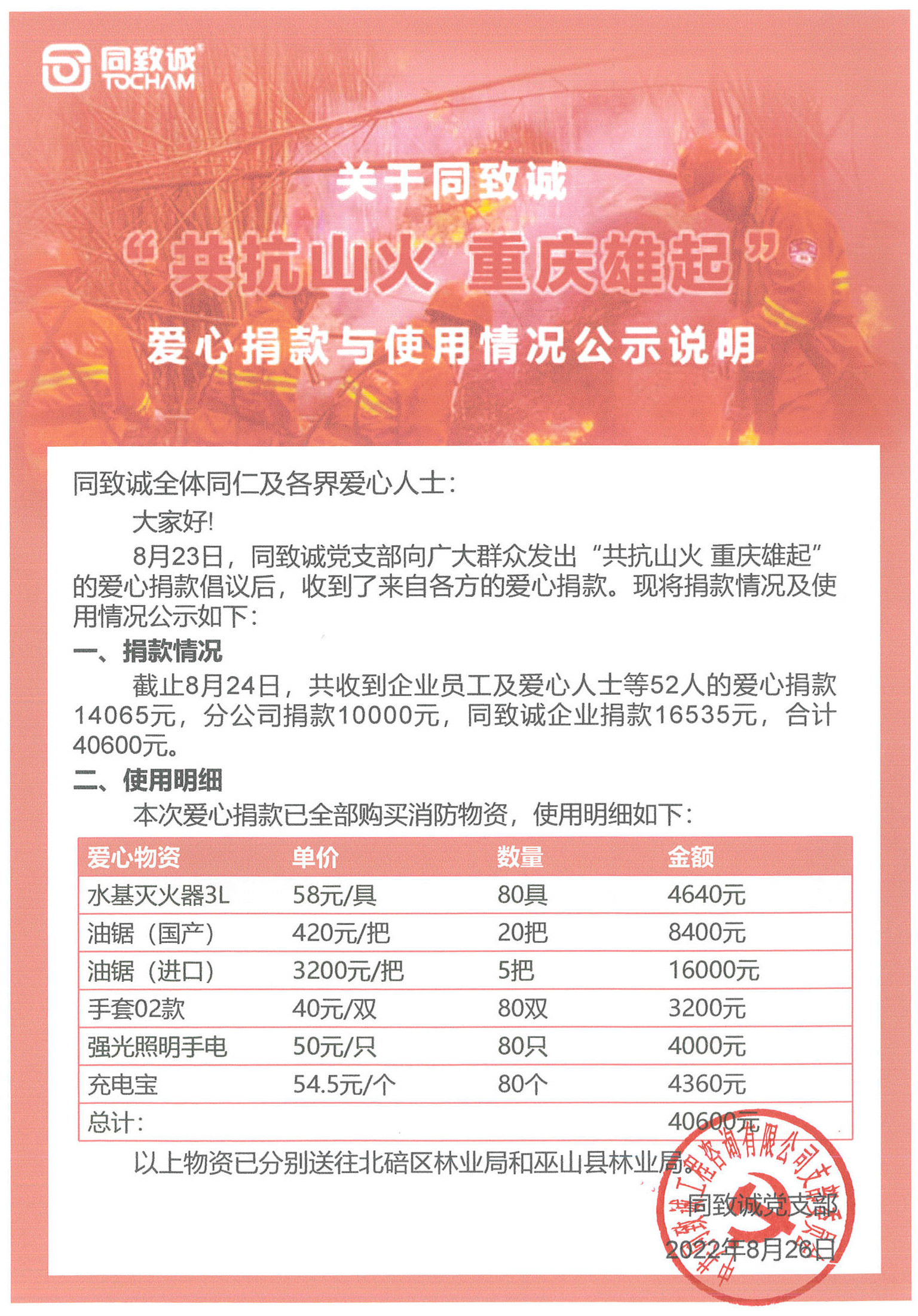 8月23日,同致誠(chéng)黨支部向大家發(fā)出“共抗山火 重慶雄起”的愛(ài)心捐款倡議后,收到了來(lái)自各方的愛(ài)心捐款。截止8月24日,共收到企業(yè)員工及愛(ài)心人士的愛(ài)心捐款14065元,分公司捐款10000元,同致誠(chéng)企業(yè)捐款16535元,合計(jì)40600元。