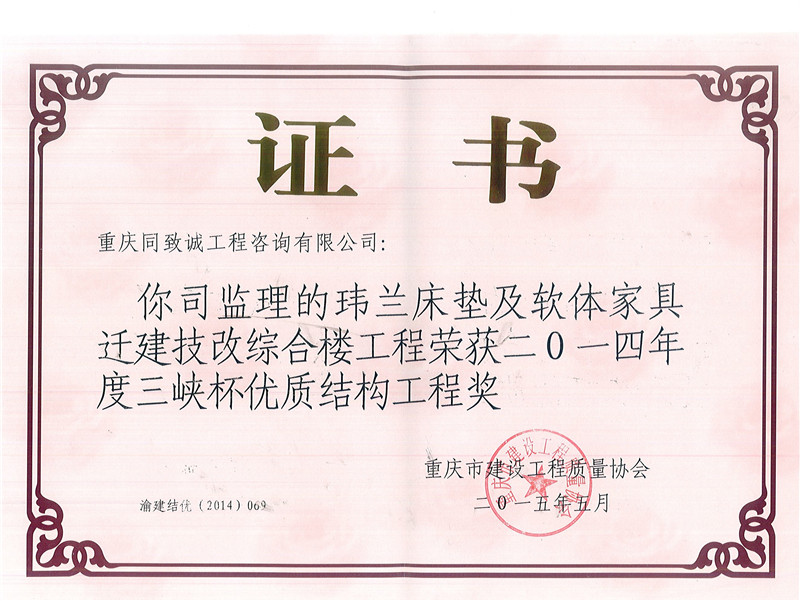 瑋蘭床墊及軟體家具遷建技改綜合樓工程榮獲二0一四年度三峽杯優(yōu)質(zhì)結(jié)構(gòu)工程獎