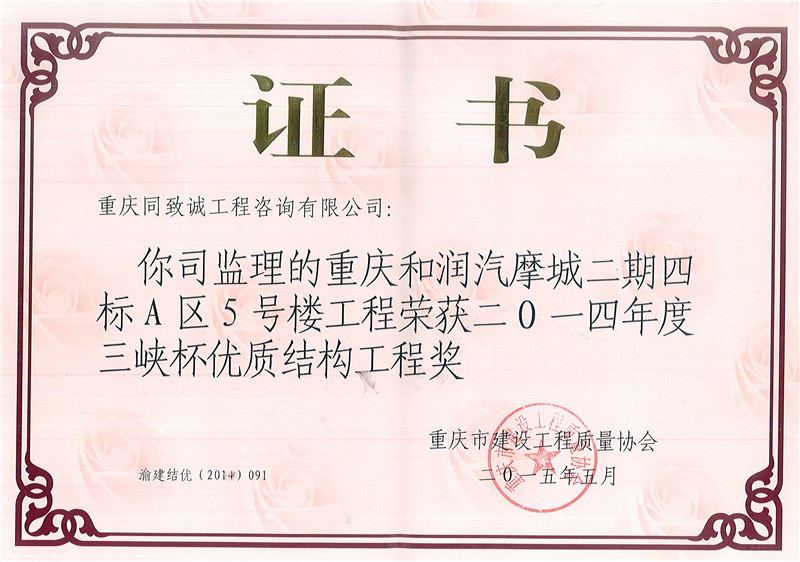 重慶和潤汽摩城二期四標A區(qū)5號樓工程榮獲二0一四年度三峽杯優(yōu)質(zhì)結(jié)構(gòu)工程獎