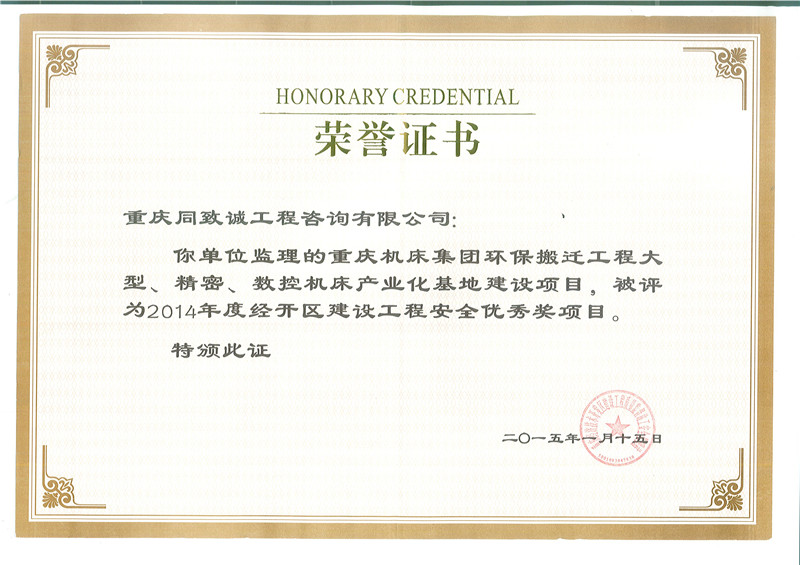 重慶機床集團環(huán)保搬遷工程大型、精密、數(shù)控機床產(chǎn)業(yè)化基地建設(shè)項目被評為2014年度經(jīng)開區(qū)建設(shè)工程安全優(yōu)秀獎項目