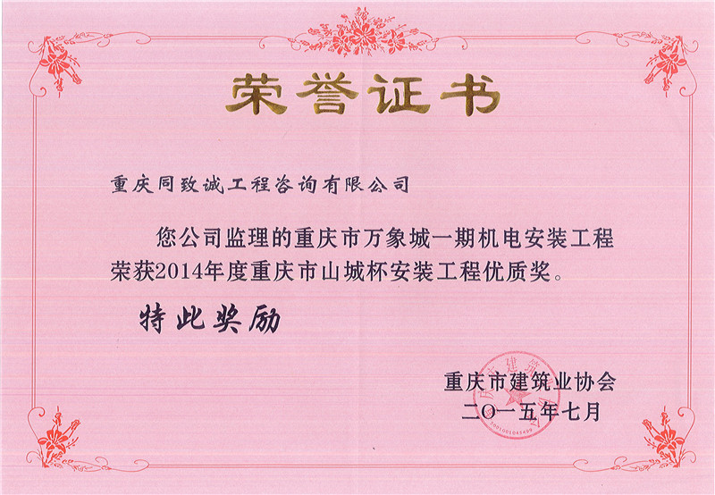 重慶市萬象城一期機電安裝工程榮獲2014年度重慶市山城杯安裝工程優(yōu)質(zhì)獎