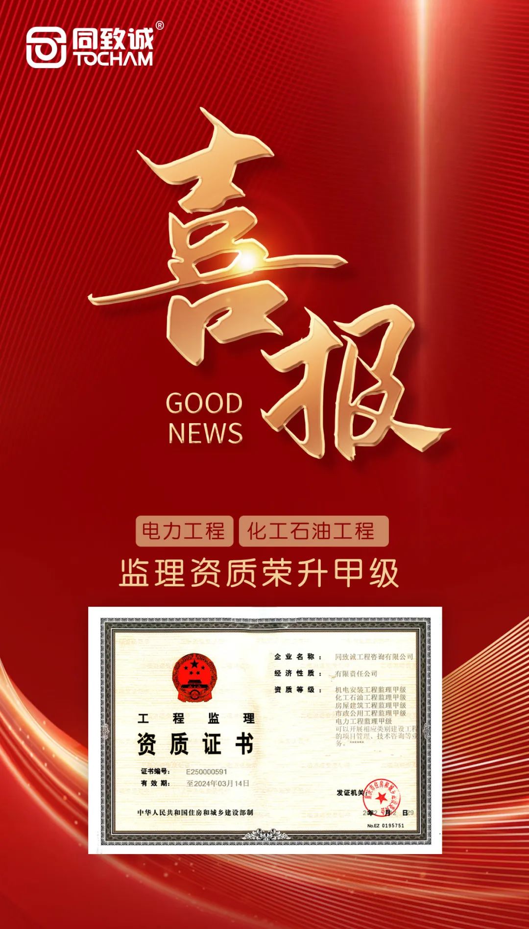 此次電力工程、化工石油工程監理資質的升級,給同致誠帶來更大的市場空間和更多的機遇,也進一步鞏固和提升了企業的行業競爭力和影響力!而公司的每一次提升和進步,都肩負著為客戶提供優質服務的責任,也承載著共同推動行業持續健康發展的使命。未來,同致誠還將向“工程監理綜合資質”沖刺,以更嚴格的標準、更嚴謹的態度要求自我,秉承“誠信、誠心、誠懇、同進、同享、同贏”的經營理念,竭誠為廣大客戶提供優質服務,為促進工程建筑行業高質量發展做出更大貢獻!