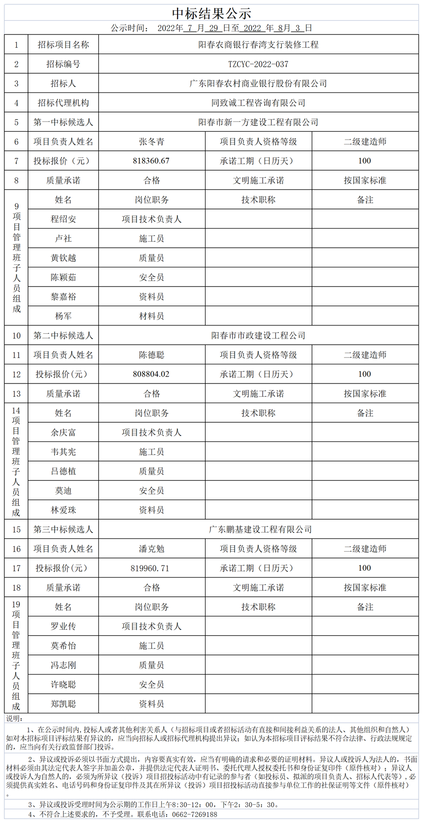 擬中標結果公示表