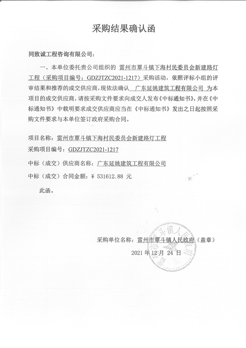 雷州市覃斗鎮下海村民委員會新建路燈工程 采購確認函