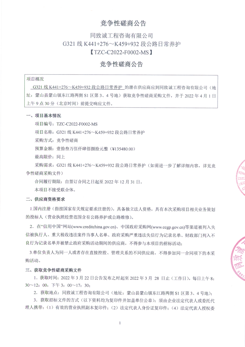 G321線K441+276~K459+932段公路日常養護磋商公告